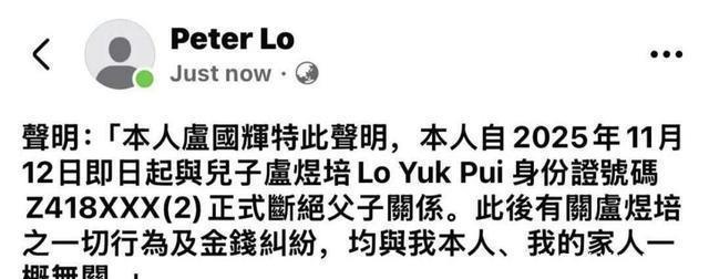替小舅子背债上千万,李克勤也得喊停,谁的钱是大风刮来的?11日,岳父卢国辉一纸声明把儿子卢煜培踢出户口本:以后他赌、他借、他跑,统统与这个家无关。英皇的霍汶希随后封口:尊重长辈,不再回应。